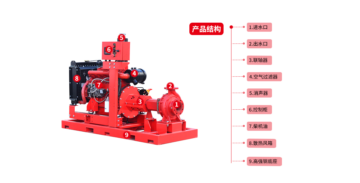 5.直連式:360kw以下柴油水泵機組采用國內*的柴油機與水泵通過彈性聯(lián)軸節(jié)直接連接技術,減少了故障點,并使機組的起動時間大大縮短,增加了機組的可靠性和應急性能;