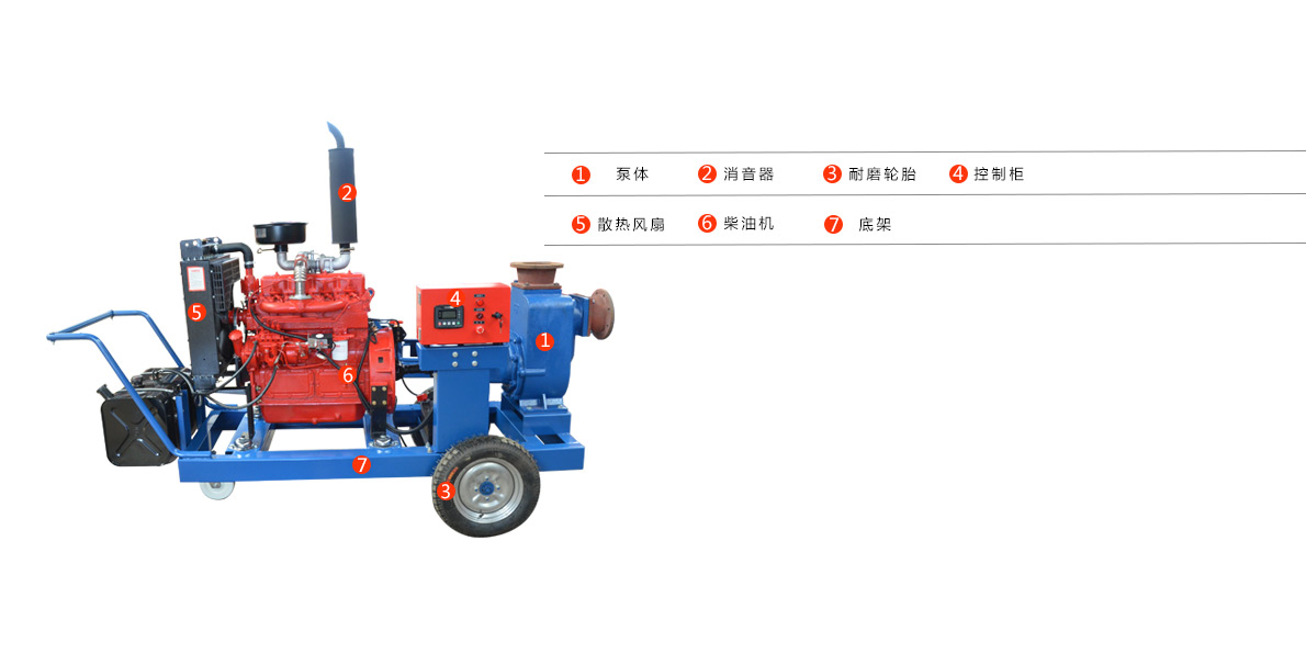 1.手推式強(qiáng)自吸移動(dòng)泵車(chē)主要由真空輔助裝置、柴油機(jī)動(dòng)力包、柴油機(jī)專(zhuān)用油箱、泵傳動(dòng)系統(tǒng)、設(shè)備底座、自吸泵總成、防雨設(shè)施、起動(dòng)裝置、起動(dòng)電源裝置、進(jìn)水管總成、出水管總成、二輪移動(dòng)拖車(chē)系統(tǒng)、快速起吊裝置等組成。